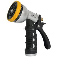 The Landscapers Select YM7674 is a heavy-duty 7-pattern self-cleaning hose nozzle designed for professional and residential irrigation tasks. Constructed from durable metal with a brass stem for precise water flow control, this nozzle features a contoured, insulated soft grip to ensure comfort during extended use. The innovative self-cleaning mechanism prevents clogs and debris buildup, while the seven distinct spray patterns offer versatility for everything from delicate misting to high-pressure cleaning. Its rear-push trigger design and soft-trim dial allow for effortless adjustments and reliable performance in any garden or job site environment.
